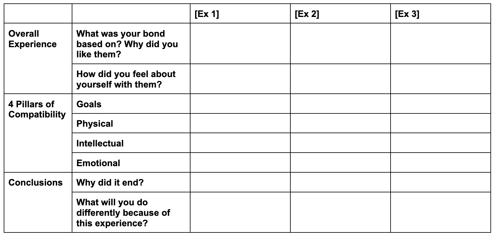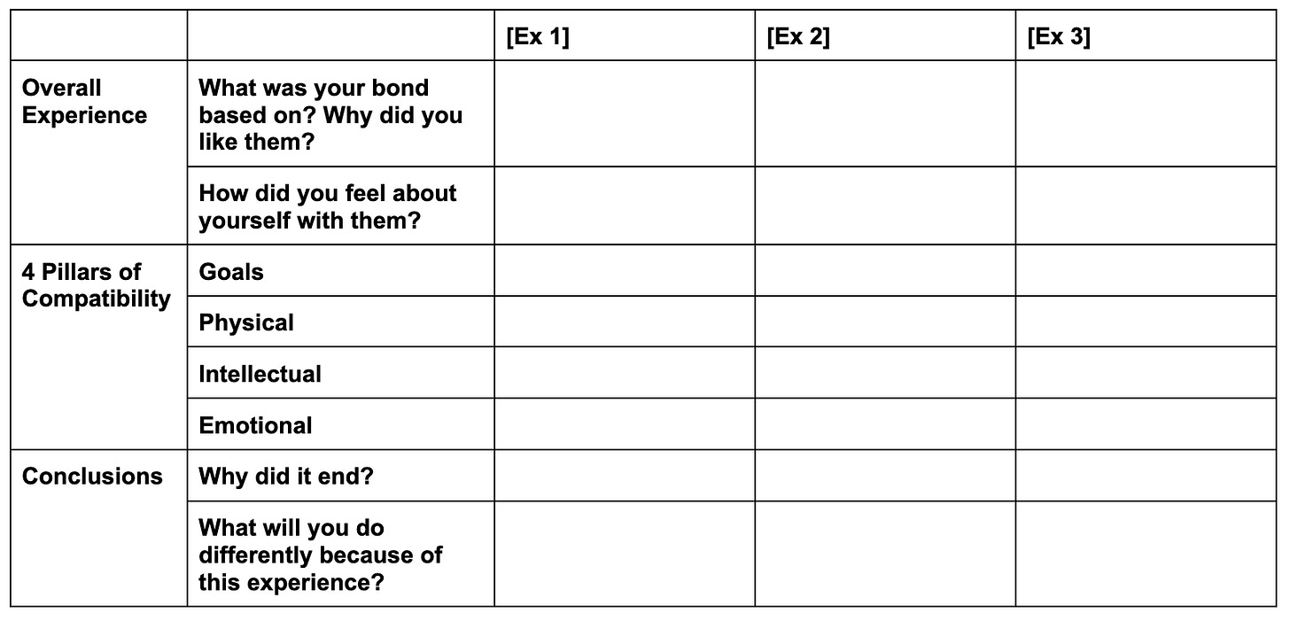 For each one, answer the questions below. I’ve included the 4 Pillars of Compatibility (GPIE) to prioritize the areas that matter for long-term success.